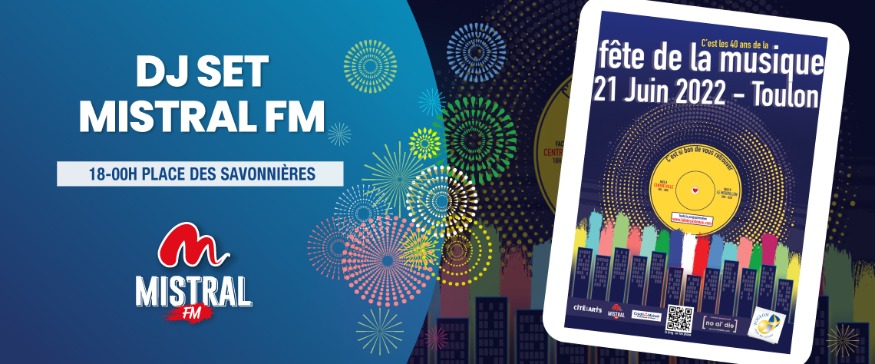 Mistral FM, radio officielle de la Fête de la Musique à Toulon, te donne rendez-vous le mardi 21 juin de 18h à 00h sur la place des Savonnières.