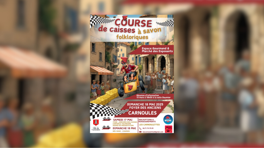 Les Carnoulettes vous donnent rendez-vous le dimanche 18 mai pour la course de caisses à savon folkloriques à Carnoules ! Un événement festif et convivial en plein cœur du village, rythmé par des animations, des spectacles et des surprises !