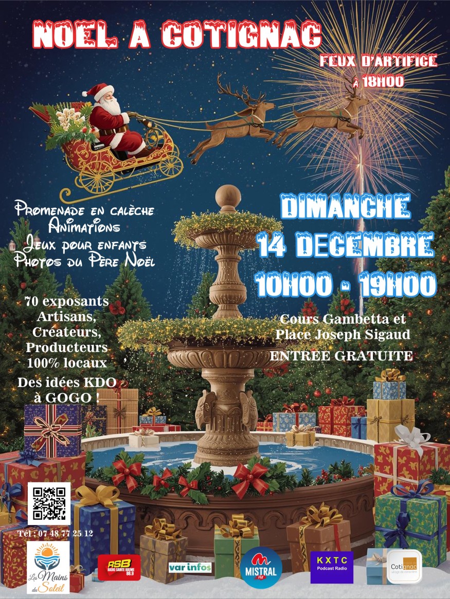 Le Marché de Noël de Cotignac se tiendra le dimanche 14 décembre 2025 dans le village de Cotignac, plus précisément au Cours Gambetta, avec un accès libre à tous. Au programme : un marché artisanal tout au long de la journée, qui permettra de flâner parmi les stands et de dénicher des idées cadeaux. Des animations festives sont prévues, de quoi ravir petits et grands. Ne manquez pas le feu d'artifice à 18h.