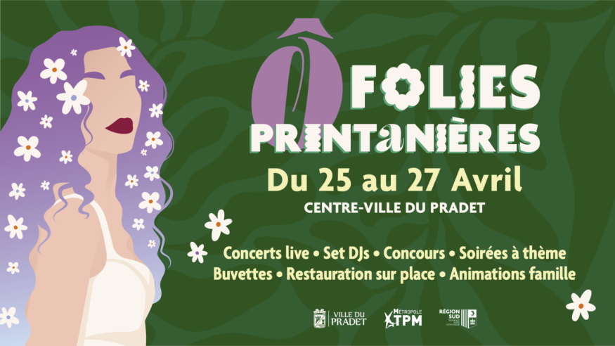 La Ville du Pradet organise la première édition de « Ô Folies Printanières », du 25 au 27 avril 2025, avec concerts en plein air, dégustations, concours et ateliers. Familles, amis et fêtards profiteront de soirées DJ Set, d'animations pour enfants, de stands de restauration locale et internationale, ainsi que de concerts live.